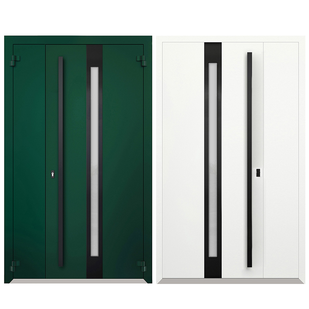 Внешняя панель: Оцинкованная сталь, атмосфероустойчивая порошковая краска (цвет на выбор), декоративная металлическая вставка (цвет черный), стеклопакет