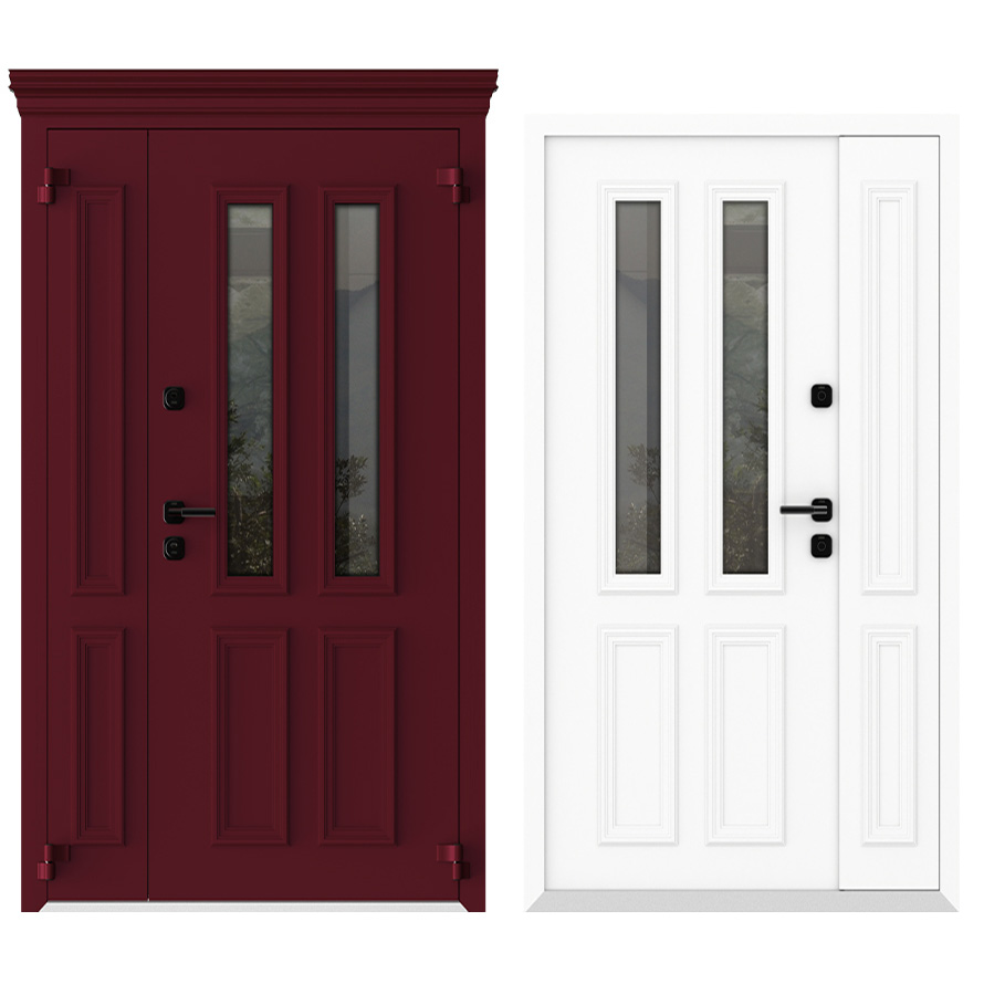 Внутренняя панель: Оцинкованная сталь, атмосфероустойчивая порошковая краска (цвет на выбор), декоративный алюминиевый штапик (неоклассич. дизайн), стеклопакет четырехкамерный, графит/бронза (на выбор)