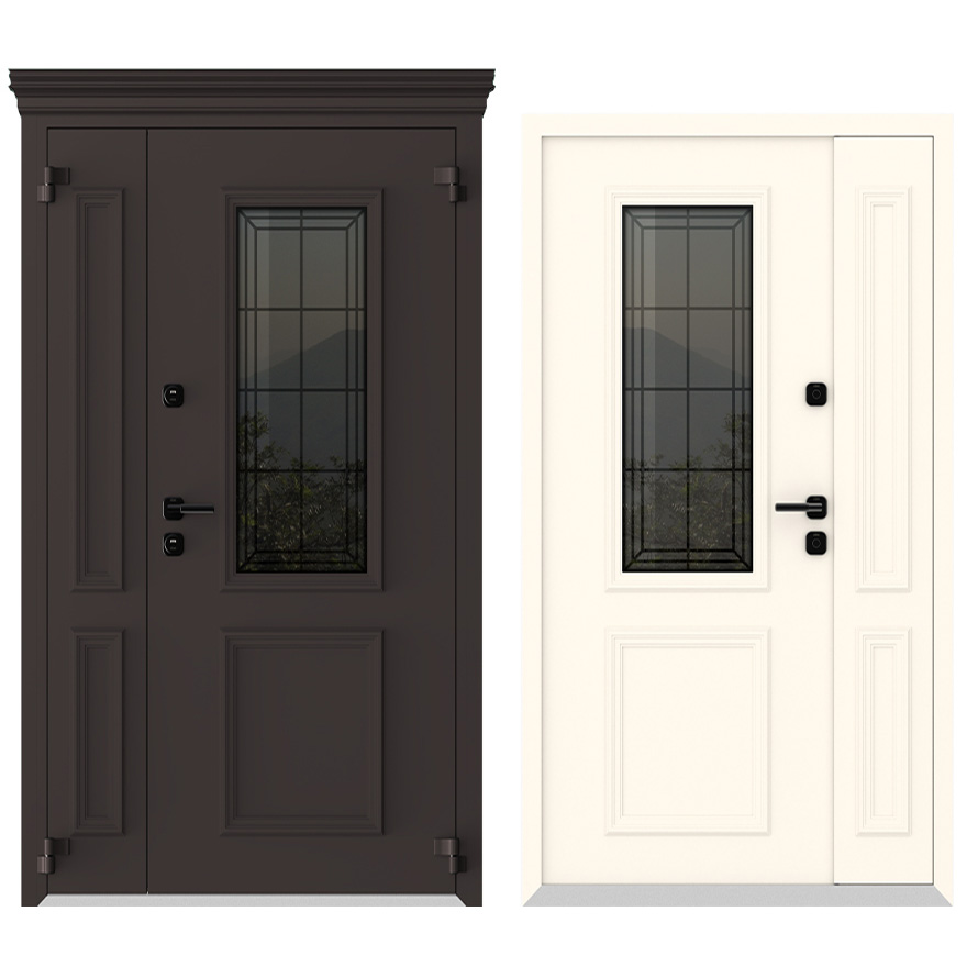 Внешняя панель: Оцинкованная сталь, атмосфероустойчивая порошковая краска (цвет на выбор), декоративный алюминиевый штапик (неоклассич. дизайн), капитель, стеклопакет трехкамерный, зеркальный бронза/хром на выбор (с черной вкладной. декор. решеткой)