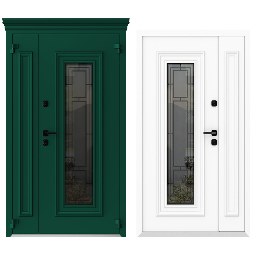 Внешняя панель: Оцинкованная сталь, атмосфероустойчивая порошковая краска (цвет на выбор), декоративный алюминиевый штапик (классич. дизайн), капитель, стеклопакет трехкамерный, зеркальный бронза/хром на выбор (с черной вкладной. декор. решеткой)