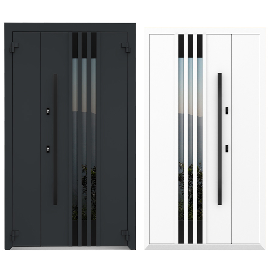 Внешняя панель: Оцинкованная сталь, атмосфероустойчивая порошковая краска (цвет на выбор), декор. алюм. рейки (цвет на выбор), декоративные металлические вставки цвет черный (цвет на выбор), стеклопакет четырехкамерный, графит/бронза (на выбор)