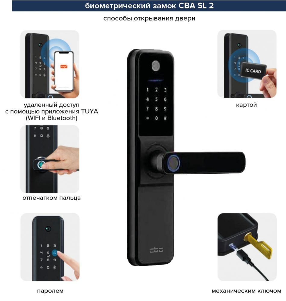 - Замковая система: Умный замок CBA SL 2 с камерой, сканером отпечатков пальцев, функцией удаленного управления через приложение (WI-FI, Bluetooth)/Дополнительный цилиндровый замок