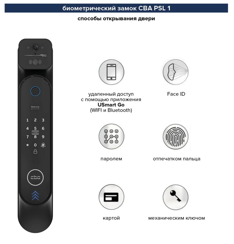 - Замковая система: Умный замок CBA PSL 1 с FACE ID камерой, сканером отпечатков пальцев, функцией удаленного управления через приложение (WI-FI, Bluetooth)/Дополнительный цилиндровый замок
