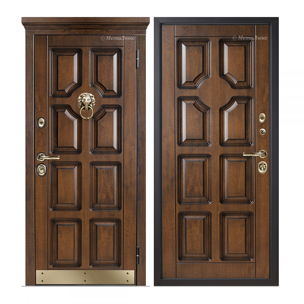Внешняя панель: МДФ 12 мм, покрытие VINORIT, цвет “Дуб золотой”, патина, ручка-стучало “Лев”, отбойник из нержавеющей стали